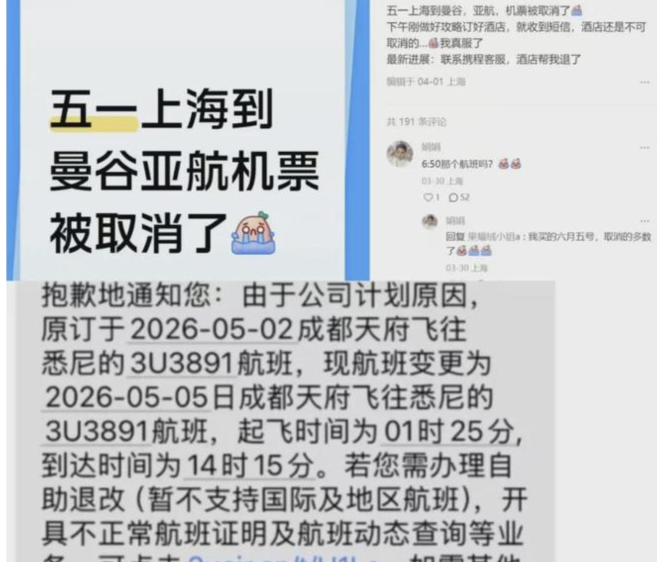 Recently, many Chinese netizens posted on social media that their flights to Southeast Asia and Australia during and around the May Day holiday were cancelled. One netizen wrote, "My AirAsia ticket from Shanghai to Bangkok for May Day was cancelled." Another said, "My flight to Vietnam for May Day was cancelled. I carefully selected the flight two months in advance so I wouldn't have to take time off work, and it was cancelled without warning. Although I can get a full refund, direct flights during the same period have already skyrocketed to 5,000 RMB." Another wrote, "My tickets from May 1st to 5th were all cancelled, and my hotel is already booked. What am I going to do?" Yet another wrote, "My flight to Kuala Lumpur, originally scheduled for the early morning of the 3rd, was suddenly cancelled and rescheduled to 3.30 am on May 4th. Then the return flight on the same airline is scheduled for 4.30 am. It's outrageous to fly back before even clearing customs..."